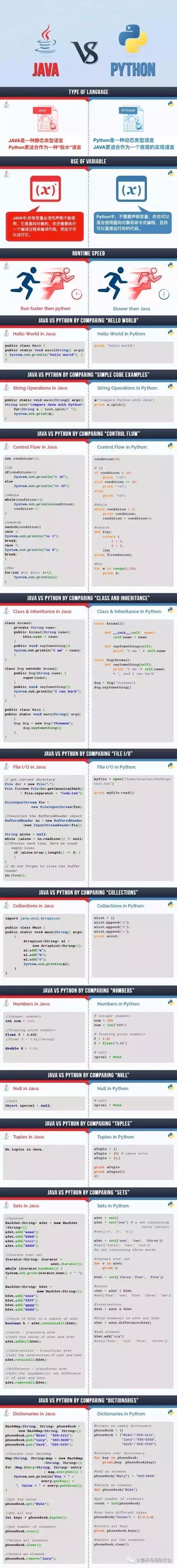 Java 和 Python 一直都是兩種很火很強大的編程語言,對于剛開始起步學(xué)習(xí)編程的同學(xué)來說,會迷惑且最經(jīng)常問的問題是,我該學(xué) Java 還是 Python,是不是 Python 容易學(xué),或是應(yīng)該先學(xué)什么編程語言等等這樣的問題。作為一名 Java 程序員,肯定會建議你先學(xué) Java,然后再學(xué) Python,但如果你問一個 Python 程序員,可能會得到一個完全相反的答案。與此同時,Python 已經(jīng)不再是乳臭未干的黃毛小子了,它已經(jīng)成長而且和主流的編程語言,像 Java,C++ 有的一拼。當(dāng)最開始接觸 Python 的時候,會覺得它是一門腳本語言,但是后來發(fā)現(xiàn)這是誤解。你也可以在 Python 中進行面向?qū)ο蟮木幊獭τ诔鯇W(xué)者,選擇一種具有吸引力的,同時有著強大社區(qū)支持的語言去學(xué)習(xí)?,F(xiàn)在 Java 和 Python 都滿足剛才說的條件,甚至在做了一些很棒的分析比較之后,依然很難得出應(yīng)該學(xué)習(xí)哪個語言。慶幸的是,我們有信息圖形,可以指出 Python 和 Java 之間一些重要的不同點。